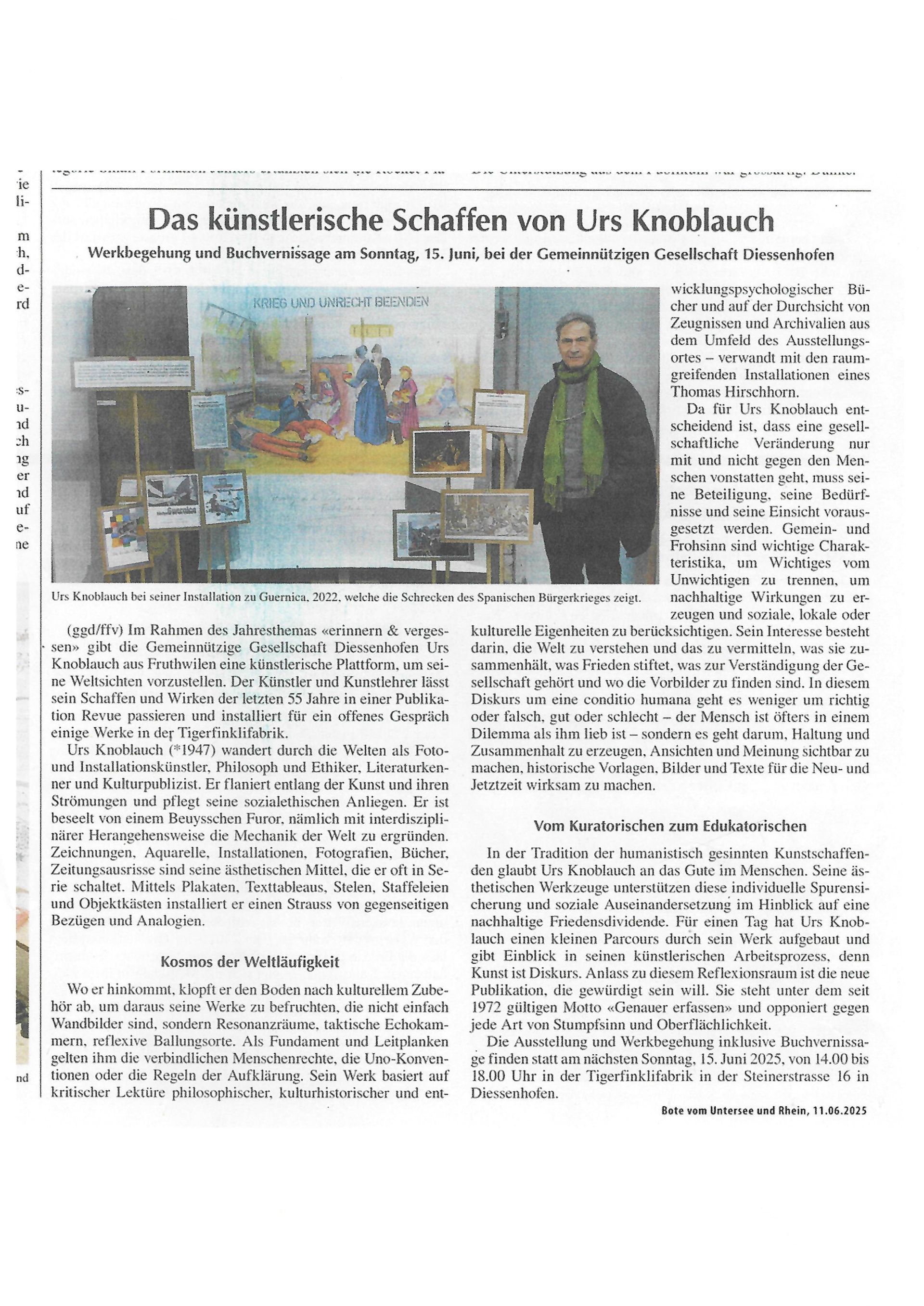 Urs Knoblauch (1947) wirkte bis 2012 am Literargymnasium Rämibühl als Zeichenlehrer (Bildnerisches Gestalten) in Zürich. Dort entstand u.a. das aufliegende Familien- und Schulbuch „Nahrung, Bildung und Gesundheit für alle“. Er war mit Vorträgen an der Volkshochschule (Universität Zürich), als Kulturpublizist und als Mitglied der Maturitätskommission des Kantons Schwyz tätig. Seit 2000 lebt er mit seiner Frau im „Atelierhaus Fruthwilen“. Als Künstler beteiligt er sich seit über 50 Jahren im Rahmen des Kunstkonzepts GENAUER ERFASSEN an zahlreichen Ausstellungen im In- und Ausland. Dabei stehen orts- und themenbezogene Arbeiten mit kulturellen, historischen, sozialethischen, psychologischen, humanitären und friedensfördernden Anliegen sowie das direktdemokratische „Modell Schweiz“ im Zentrum. Ebenso wird der Kulturbegriff im Sinne von „agricultura“ verstanden (Landwirtschaft, Natur, Ernährungssicherheit, Handwerk, Technik und Künste). Damit wird auf das sehenswerte Vinorama-Museum Bezug genommen. Im Dialog von Fotografie, Malerei, Text und Literatur entstanden Werkreihen zu Meinrad Inglin („Die Welt in Ingoldau“, „Schweizerspiegel“), zu Gottfried Keller („Der grüne Heinrich“), zu J.W. Goethes „Schweizerreisen“, Friedrich Schillers „Wilhelm Tell“ und Leo Tolstois „Wieviel Erde braucht der Mensch?“ Das Bild „Krieg und Unrecht beenden – Hommage an die neutrale, humanitäre und wehrhafte Schweiz mit ihrer direkten Demokratie und Friedenskultur“ entstand 2021 und bezieht sich auf das 150. Gedenkjahr des Deutsch-Französischen Krieges und das Flüchtlingsdrama mit der Internierung der Bourbaki-Armee in der Schweiz 1871. Es nimmt Bezug auf das Meisterwerk „Hospitalité suisse“ (1871) von Albert Anker (1831-1910). Der Künstler wirkte damals selber an der humanitären Hilfeleistung mit. 87‘000 erschöpfte und verwundete Soldaten mit Pferden wurden in der Schweiz aufgenommen, auf die Kantone verteilt und fürsorglich gepflegt. Im Kanton Thurgau wurden über 4000 Bourbaki-Soldaten aufgenommen. Zahlreiche Soldaten wurden im Kantonsspital Münsterlingen behandelt. Das 1863 von Henry Dunant (1828-1910) gegründete Rote Kreuz leistete einen ersten grossen Einsatz. Der Schweizer Maler Edouard Castres, der im Krieg Rot-Kreuz-Helfer war, schuf dazu das eindrückliche „Bourbaki-Panoramabild“, welches in Luzern zu bewundern ist. Künstlerfreunde, wie beispielsweise Ferdinand Hodler, halfen Castres bei der Arbeit am Bild. Die Ausstellung und das Werk „Krieg und Unrecht beenden“ sollen zur Stärkung des „Modells Schweiz“, zur gewaltfreien und diplomatischen Konfliktlösung sowie zur Friedenserziehung beitragen.